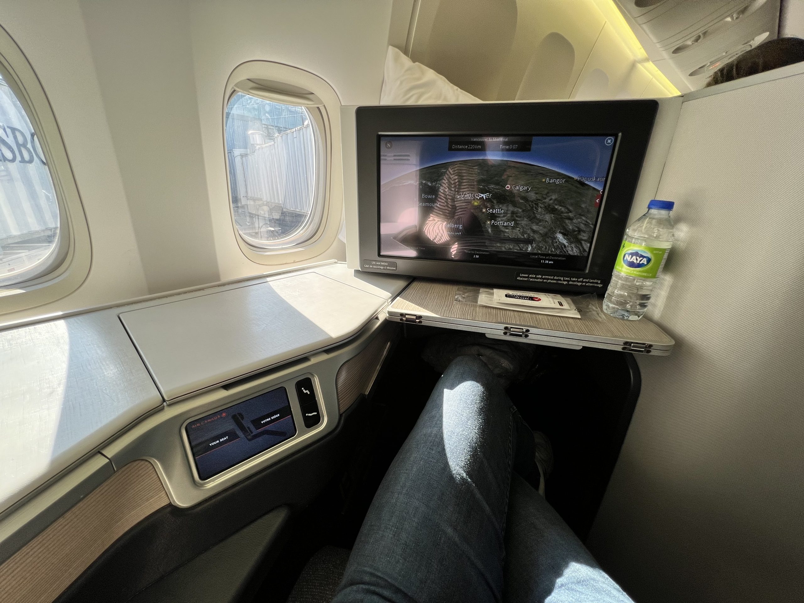 This airplane and business class layout is new and looks great at the first glance. The service, the food and inflight entertainment are excellent. However this layout is not optimal to my opinion. All seats have angle which doesn’t feel comfortable during take-off and landing or during turbulence. Further the angle makes it difficult to look out of the window. For the middle seats the angle makes it almost impossible to communicate with your neighbour. However, the biggest problem is the sleeping space. The table is too low making it hard to sleep on your side. The only optimal sleeping position is on your back.