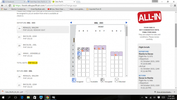 We travelled with Cebu Pacific on 9 November returning on 20 November. In our party were 6 adults, 3 children and 1 infant. All seats were allocated in Seat row 1 and 3.
