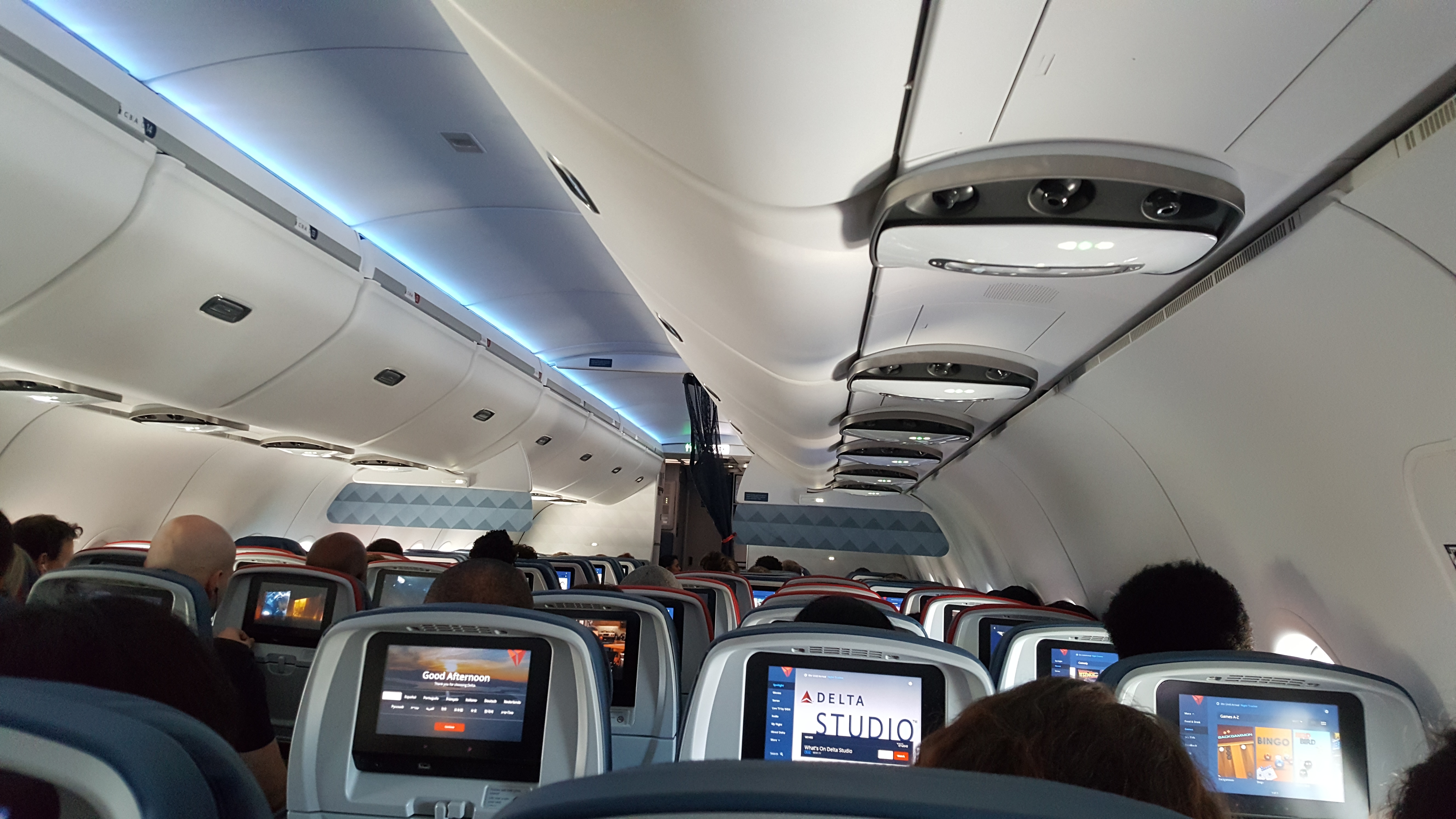 Was in F. The F product on the plane is rubbish. In F you don't expect the seatback of the seat in front of you to be in your knees when the person in front of you reclines. Avoid the A320 F cabin if you are tall. Worst of the DL jets.
