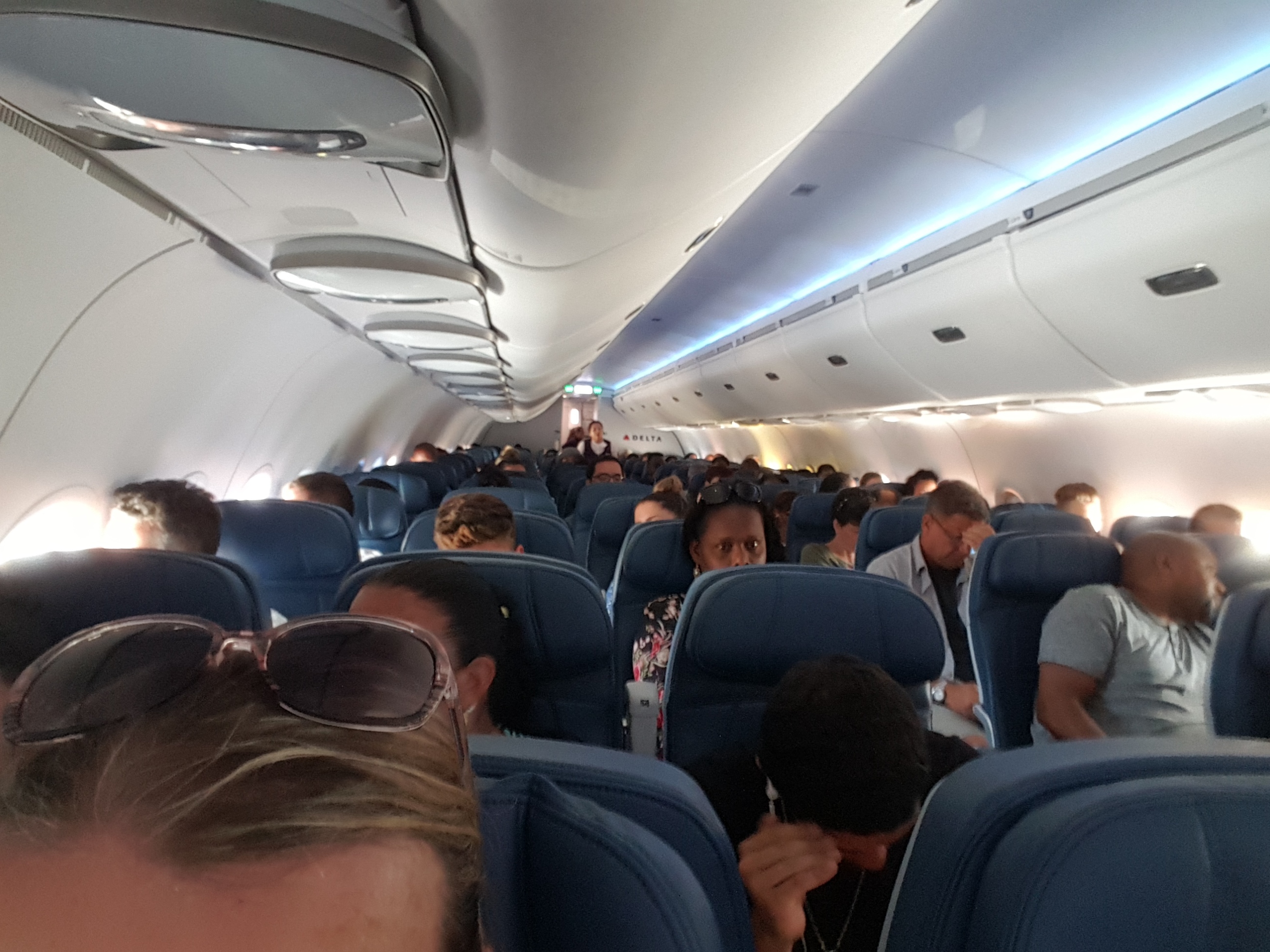This airplane is very nice, and with the new delta interiors it make for a very pleasant 45 minute flight. Also, the fact the tray tables are in the armrests in first class seems to create quite a bit more room.