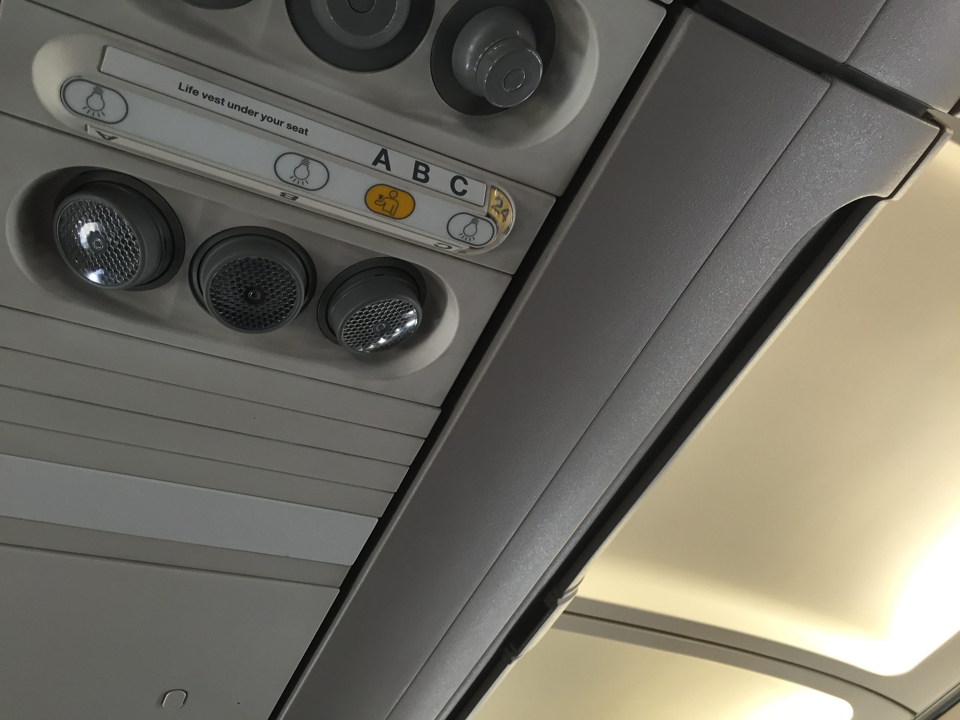 We had emergency exit row seats (about row 12) and they were fine with a little bit of extra legroom, but no left arm rest for seat A. We got a drink and a biscuit.