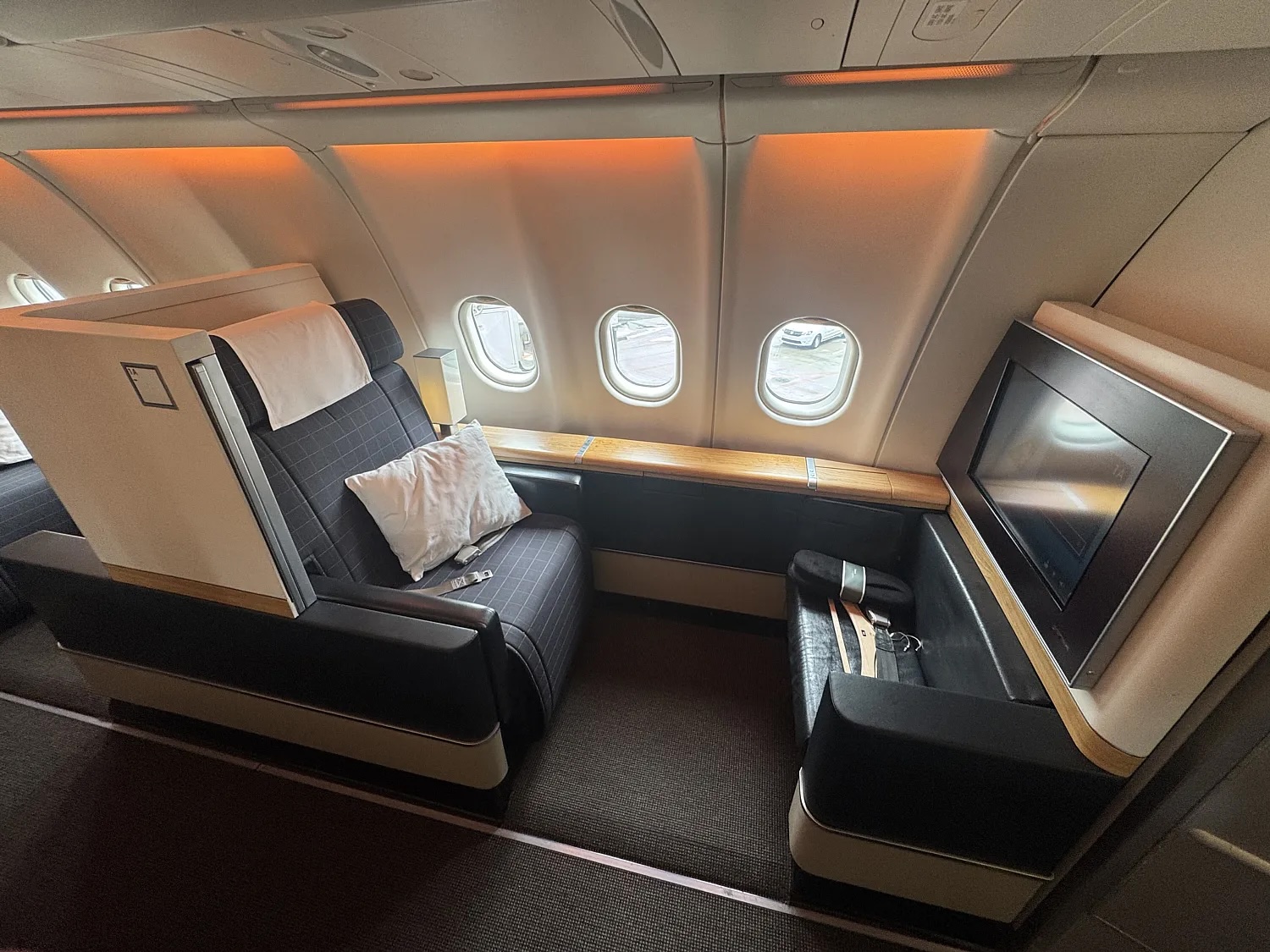 The SWISS First class seat on the Airbus A330 offers solid comfort, but it clearly shows its age. The padding and sleeping surface are perfectly fine for an eight-hour flight, yet the overall design feels dated compared to modern First class products. Privacy is limited, especially with a full eight-seat cabin, and without sliding doors or a more enclosed layout, it feels closer to an older generation Business class than a true flagship experience. Storage space does the job, but the inflight entertainment system feels old and doesn’t really add much to the flight.