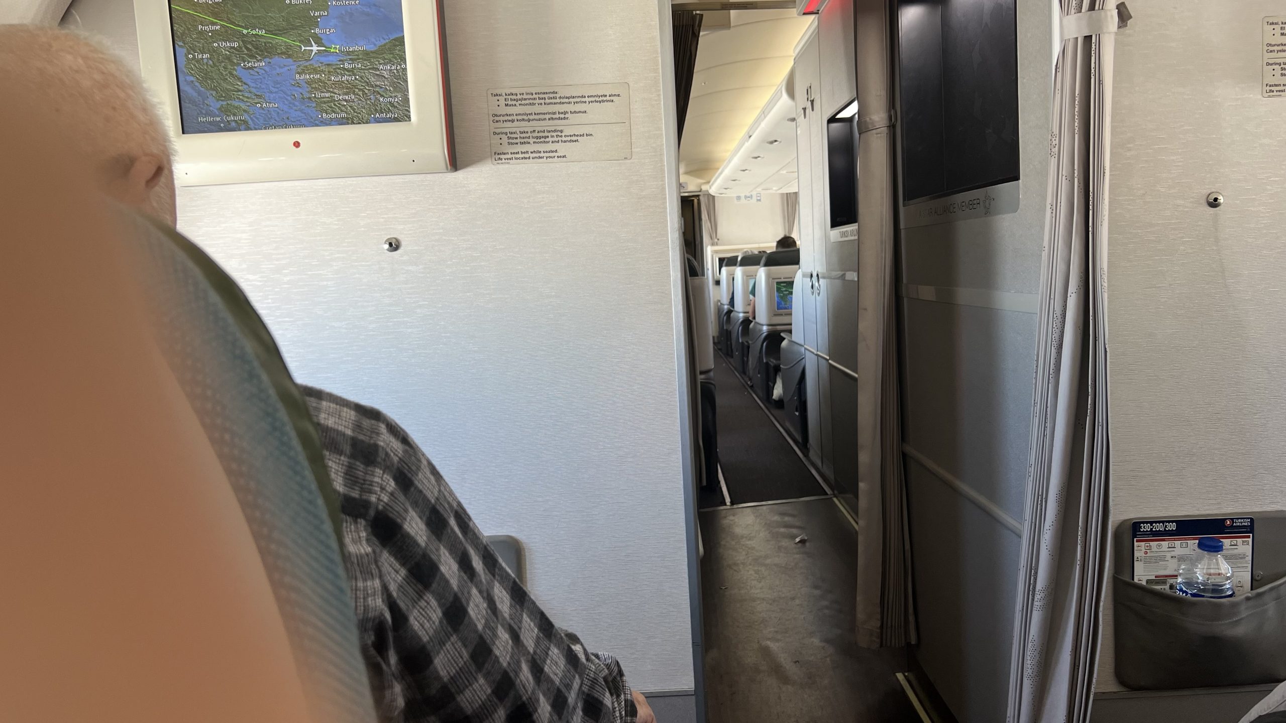 Only 7 years old aircraft(A333,in detail: A330-343 / TC-LOF) , seating different to plan here (see photo). Everyting inside looking quite old and a bit chubby. Not sure if the seats were really flatbeds, doubt it. Despite the look and feel of the aircraft, service and food was really good. As we were only 5 people in BC service quality was outstanding.