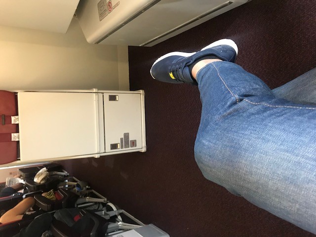 Luckily the flight wasn't that full. In my row of four, there was just me and one other passenger, each with an aisle seat, so we used the middle seats as extra storage. Otherwise it would have been VERY tight. Yes, there's a metal box under the seat in front but it's quite narrow and didn't bother me that much. Leg room was standard i.e. JUST ABOUT enough to squeeze in.